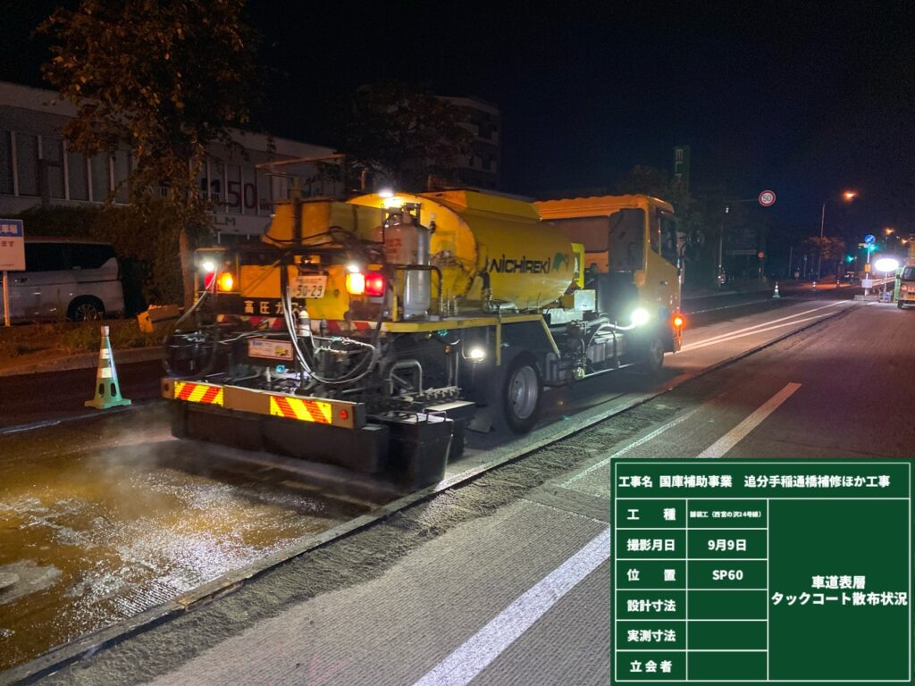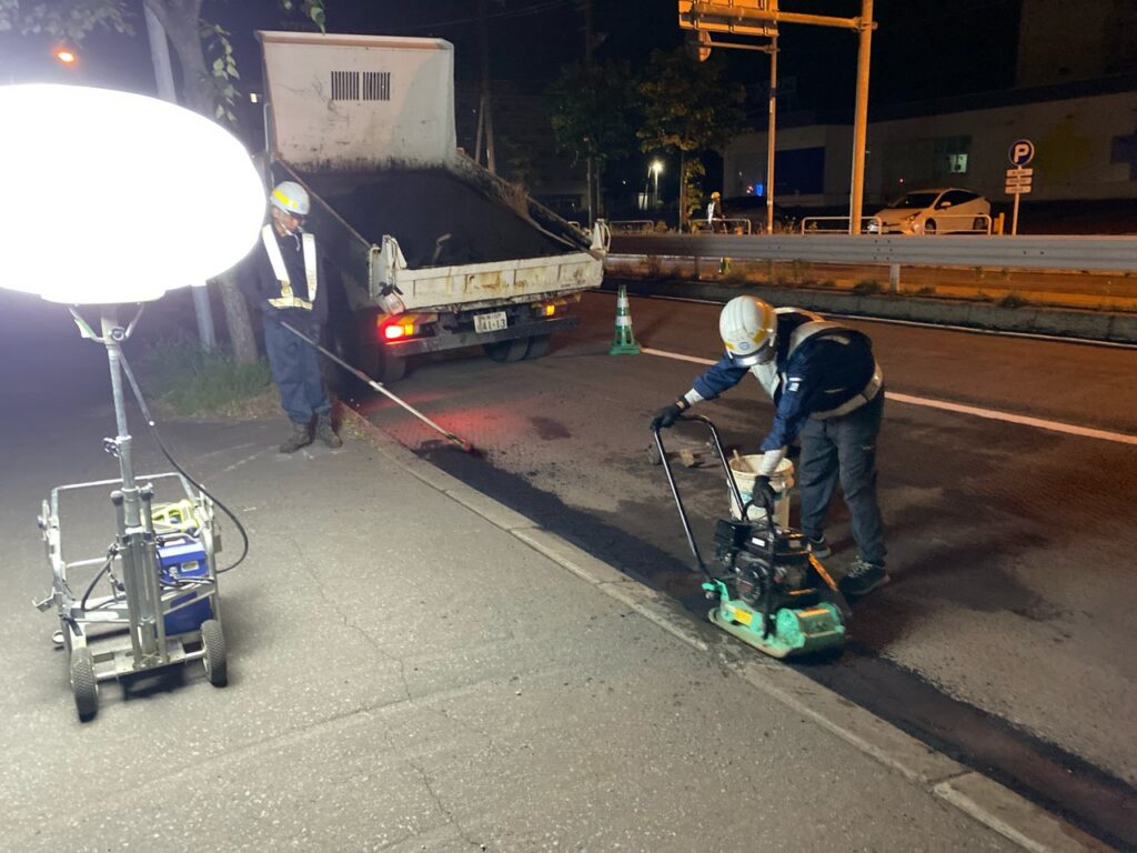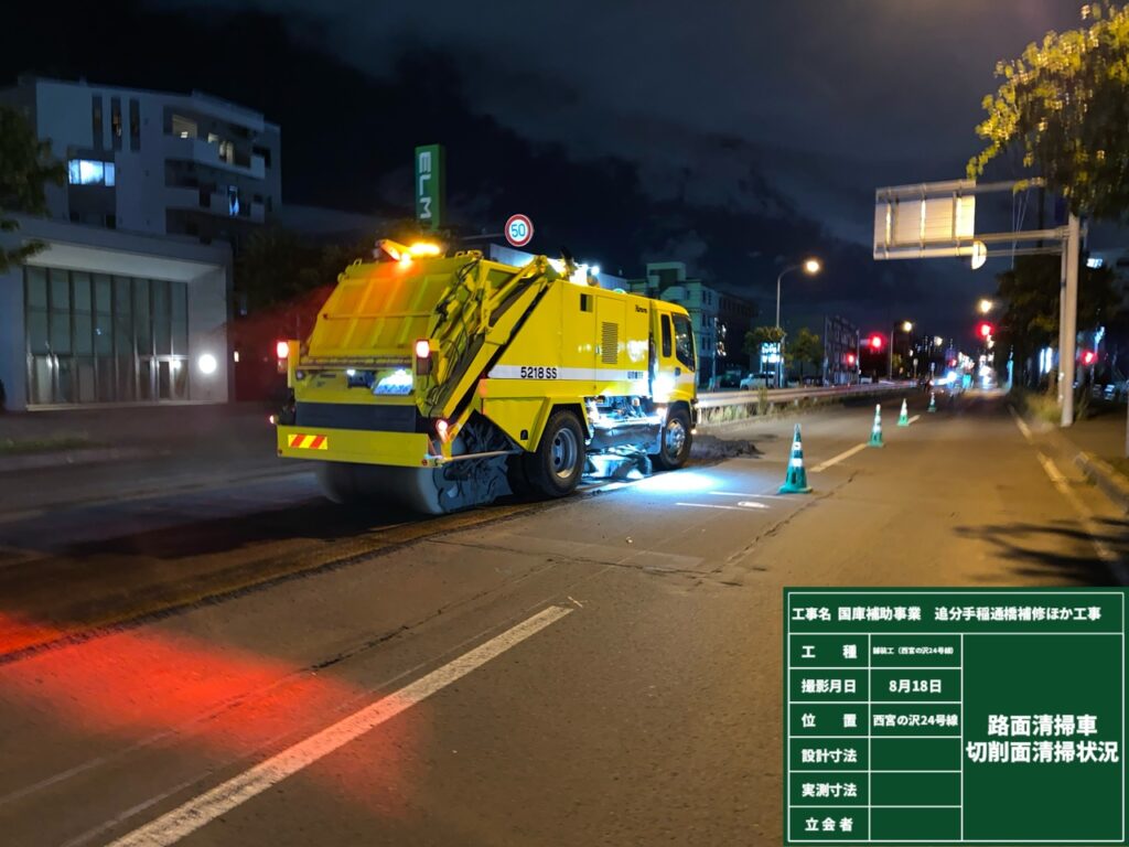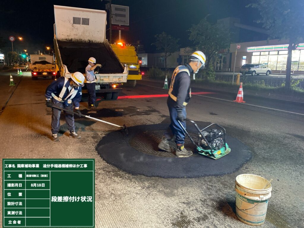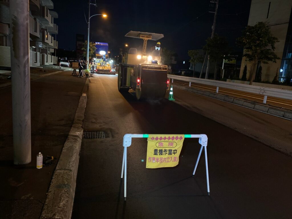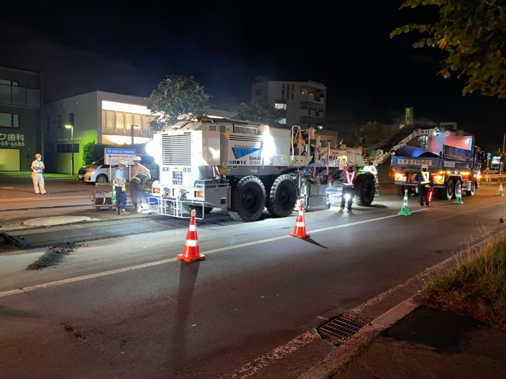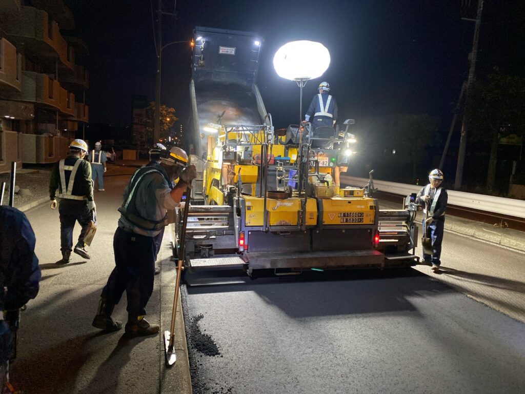 切削オーバーレイを施工には路面切削機と10tダンプなどの大型車両を使用しながら施工しますので、交通渋滞を緩和するため夜間に施工しました。