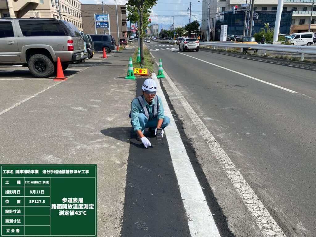 縁石の設置完了後、舗装を復旧し、アスファルト合材の温度が下がったことを確認し完了です。