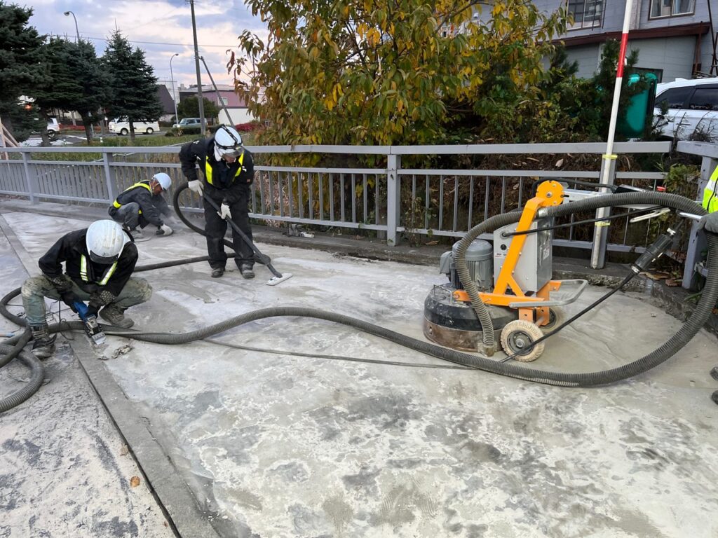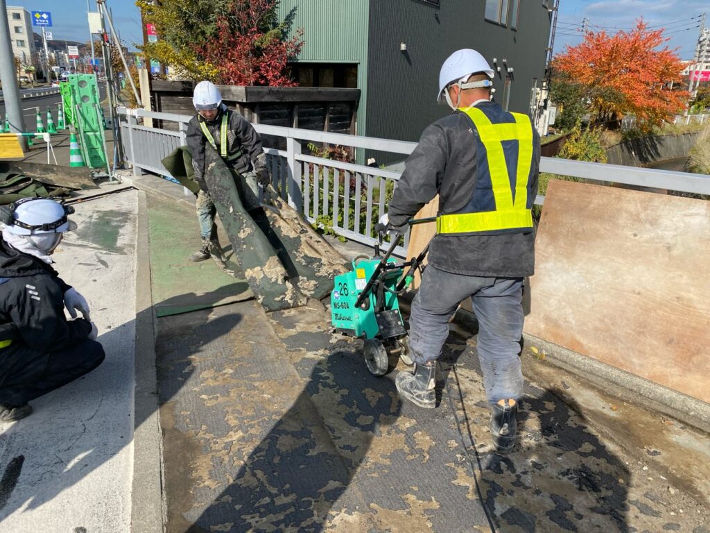 再び路面切削機を用いて舗装を切削し、縁石を撤去したのち、研掃機で橋のコンクリート表面を平滑にします🚧