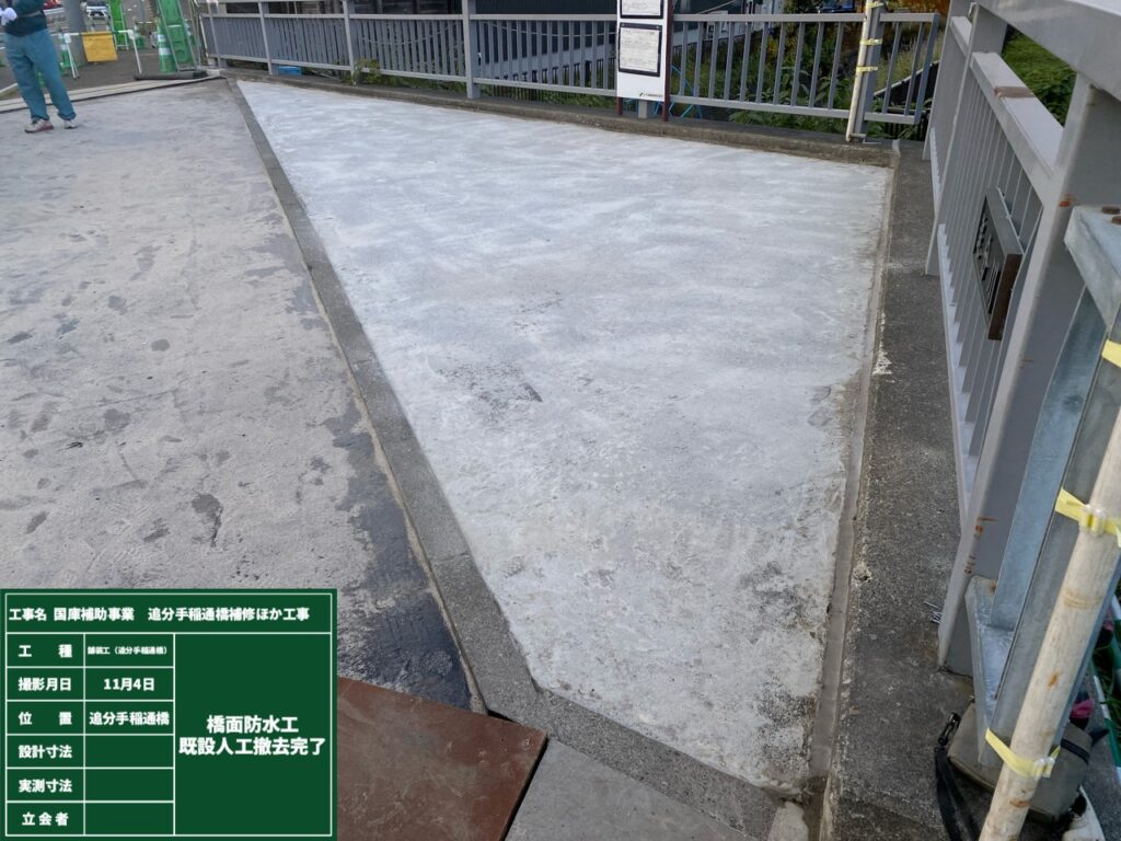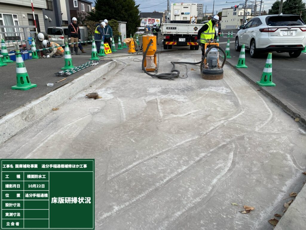 研掃が完了しましたら、塗膜防水を塗布し、縁石と舗装を復旧して車道部は完了です👍