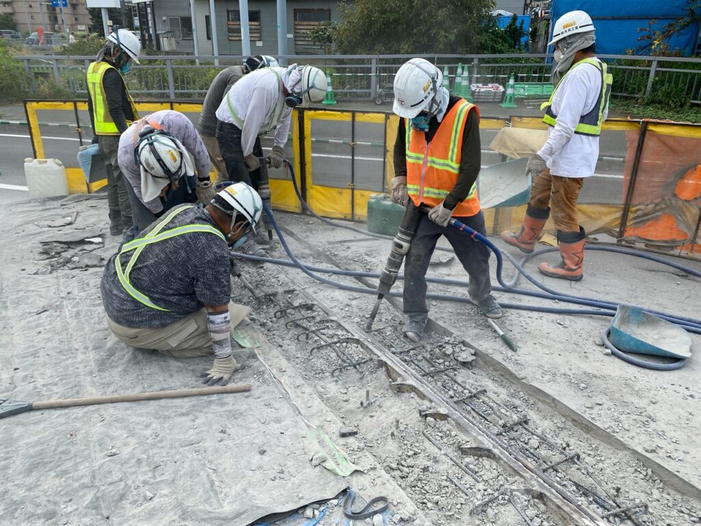 伸縮装置は約30mぐらいの長さがあり、一度にすべてを施工することが困難なため、今回は6分割に分けて施工を行いました。施工の途中では一部24H車線減少規制を設置し、通行される皆様には大変ご理解ご協力いただき誠に有難うございました。