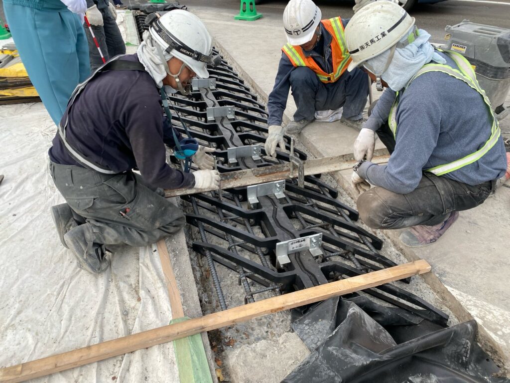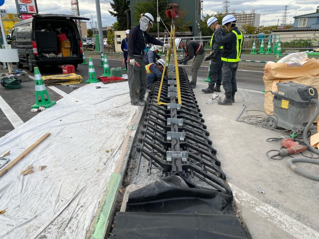撤去完了後、新しい伸縮装置をセットし、ジェットコンクリートを周りに打設していきます。同様の手順で歩道部も取り替えます。