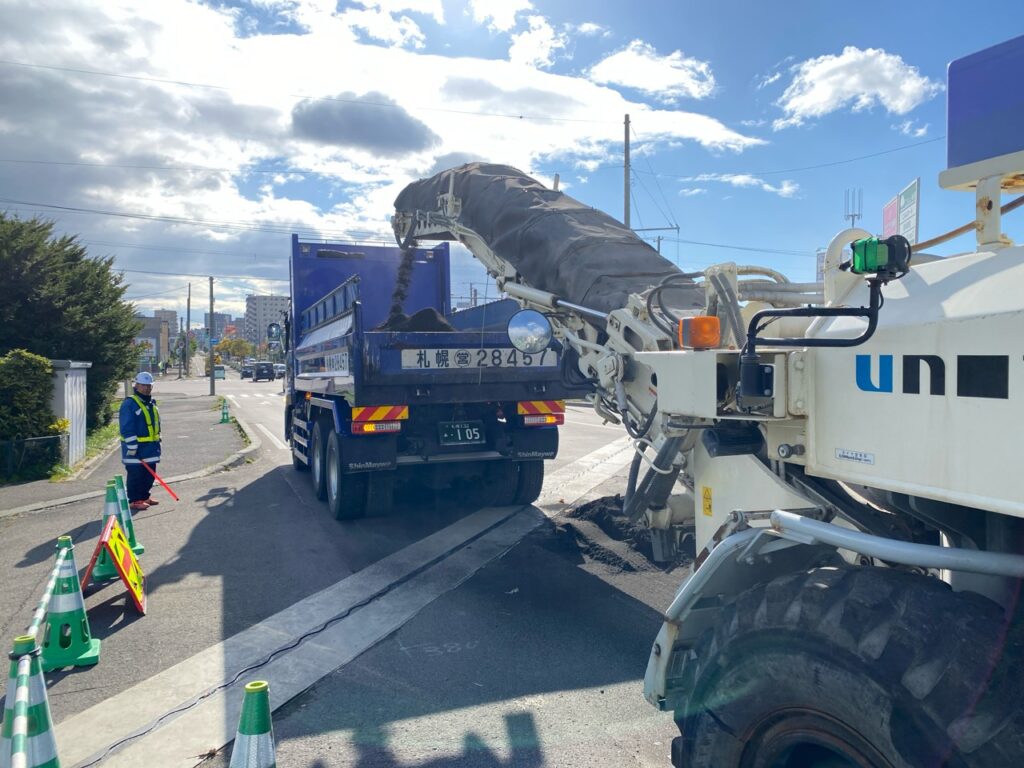 大型切削機で路面を切削し、表面に残った切削殻を路面清掃車で順次清掃していきます。