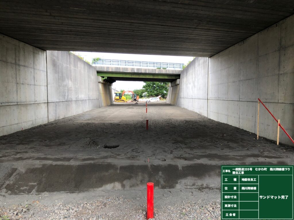 さて次は地盤改良(サンドマット)を行いました。サンドマットは軟弱地盤上に50㎝砂を敷き均し、盛土した際の地中から上がってきた水を逃がすための工法です。