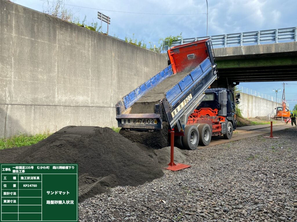 サンドマット完了後は路体盛土を行います。施工方法が通常と変わりないですが、軟弱地盤上なので1日1層(30㎝)と時間を掛けて盛土を行います!