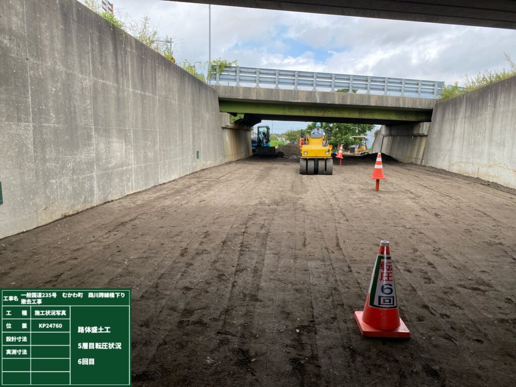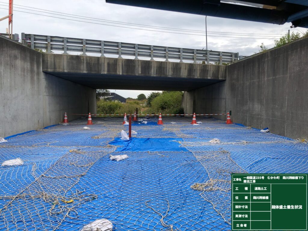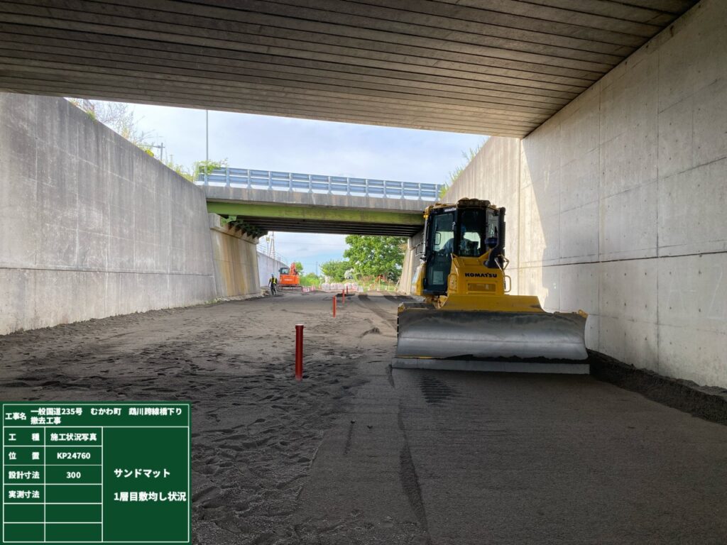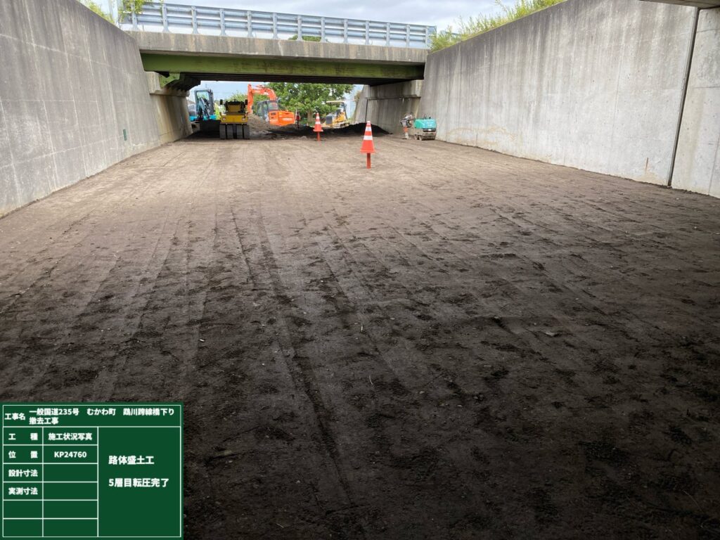 工事車両走行箇所の整備と軟弱地盤上での盛土なので、周囲に変状等の影響が出ないよう沈下板、変位杭を設置し盛土後は日々観測しながら作業を進めていきます。次回はサンドマット、緩速盛土をお伝えしたいと思います。