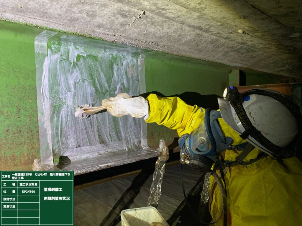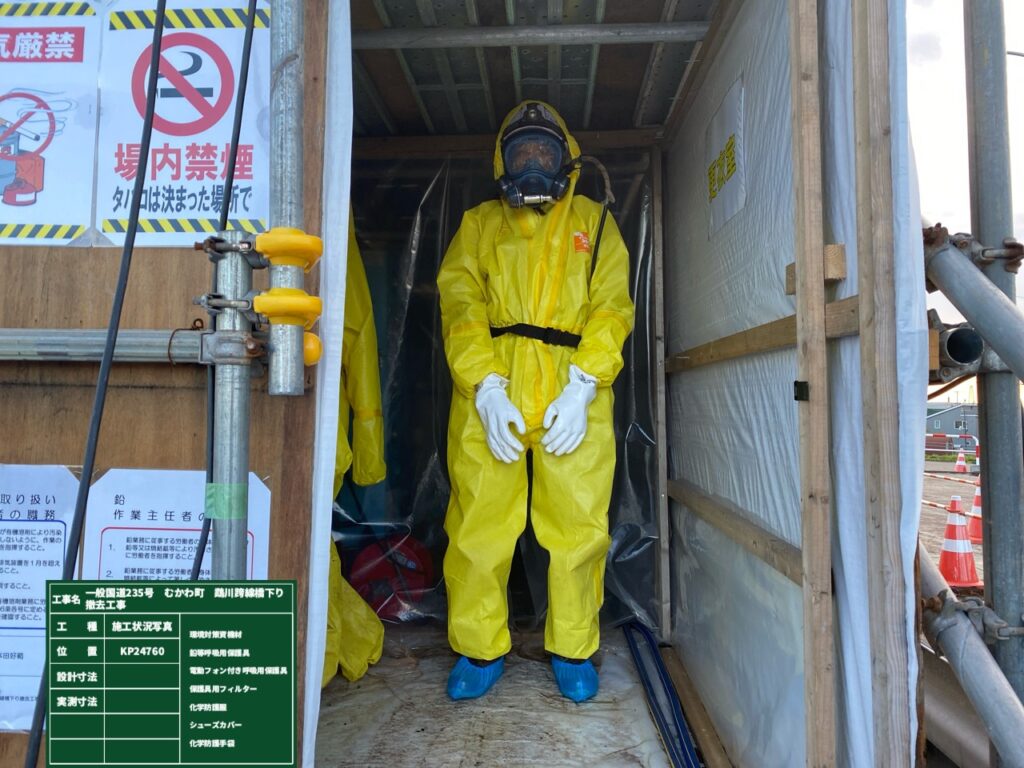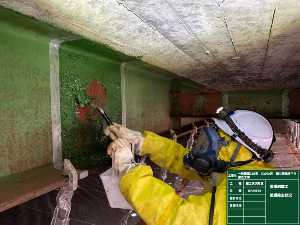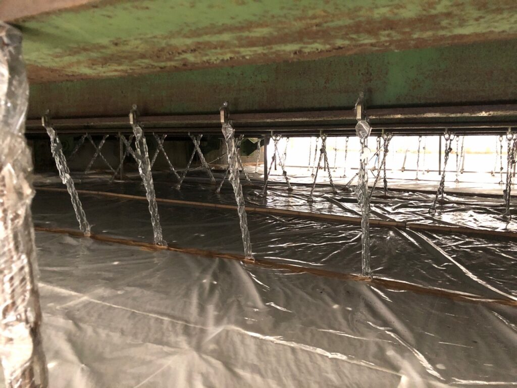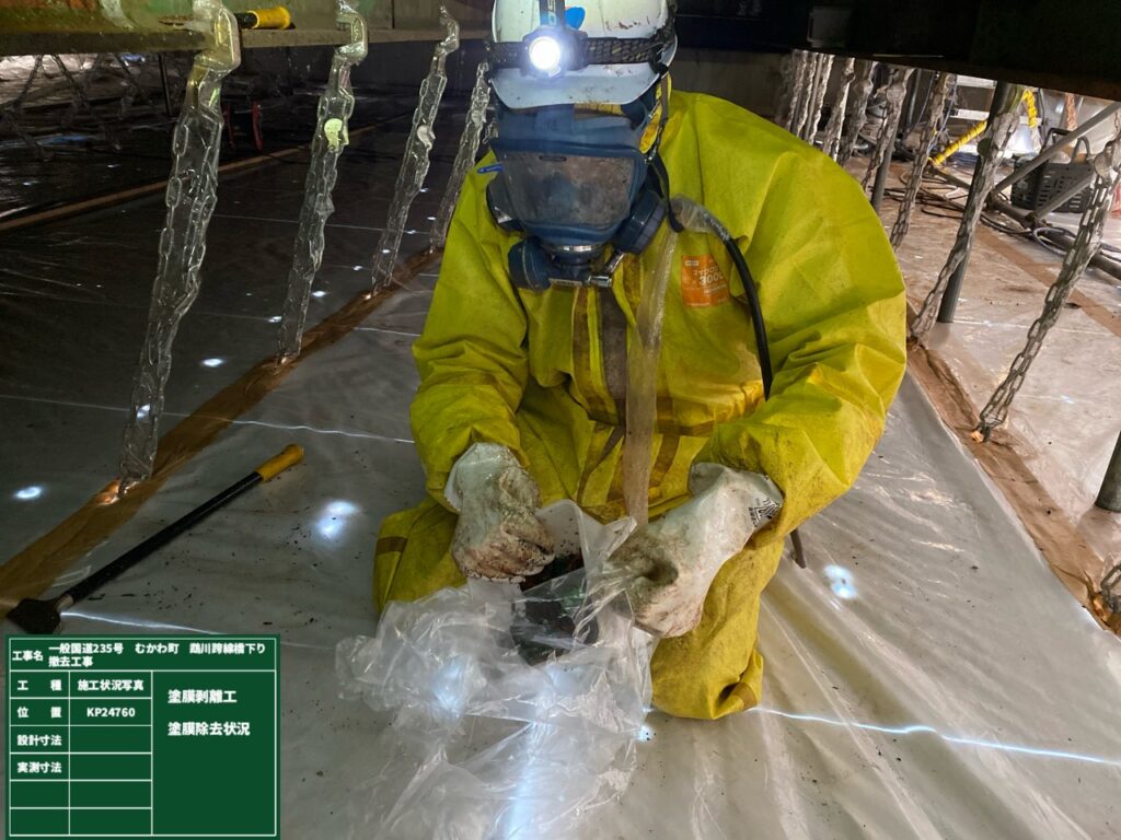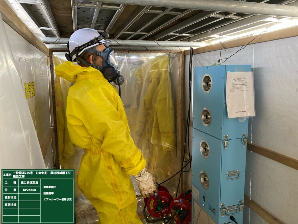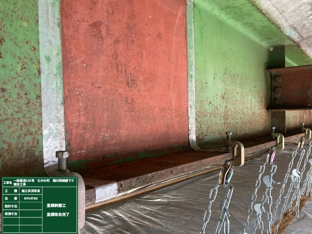 さて上部工の撤去に先立ち吊足場の設置と鋼桁切断部の塗膜除去を行いました。塗膜には鉛が含有しているので鉛中毒予防規則に則り足場内を密閉した作業となります。