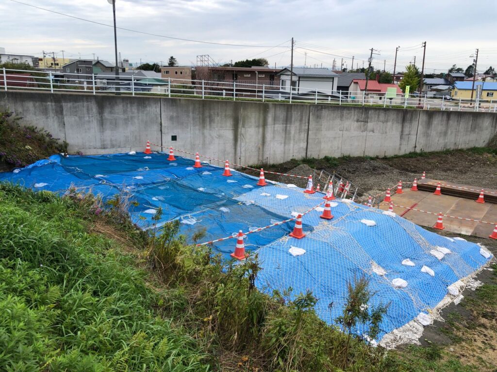 偉そうな人はしっかりしているので盛土後は全面にシートで養生します。風が強いのでネットもかけます。