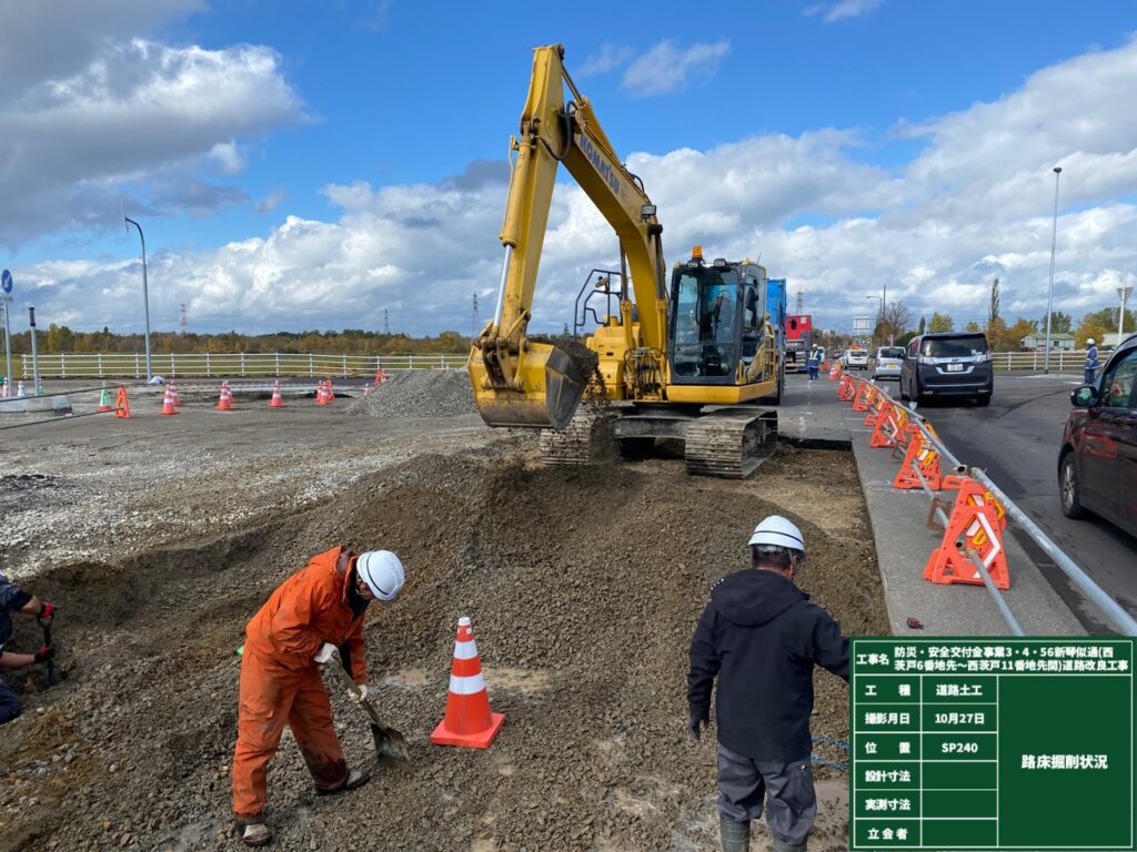 本工事は、屯田茨戸通と新琴似通の交差点及び道路改良工事です。